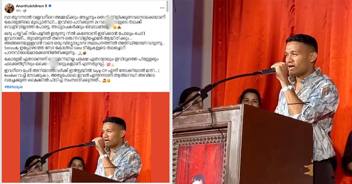 വാ തുറന്നാല് വല്ലവരുടെയും അച്ഛനെയും അമ്മയെയും തെറി വിളിക്കുന്നയാളാണ് സായിപ്പ് ഓ.പിയെന്ന് പറഞ്ഞുകൊണ്ടാണ് പോസ്റ്റ് ആരംഭിക്കുന്നത്. കോളേജില് പഠിക്കുന്ന വിദ്യാര്ത്ഥികള്ക്ക് ബോധമില്ലാത്തത് പോട്ടെയെന്നും അധ്യാപകര്ക്കും ബോധമില്ലേയെന്നും പോസ്റ്റില് ചോദിക്കുന്നു ജെന് സീ തലമുറയുടെ പോക്ക് എങ്ങോട്ടാണെന്നും പോസ്റ്റില് കുറിച്ചിട്ടുണ്ട്.