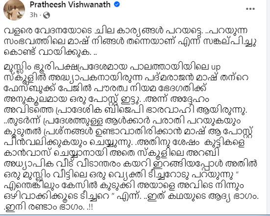 കൂടുതല് പ്രശ്നങ്ങള് ഉണ്ടാകാതിരിക്കാന് പൗരത്വ ഭേദഗതിയെ അനുകൂലിച്ചുള്ള പോസ്റ്റ് പത്മരാജന് ഡിലീറ്റ് ചെയ്തിരുന്നു. എന്നാല് ഇതിനുപിന്നാലെ പാലത്തായി സ്കൂളിലെ ഒരു അറബി അധ്യാപിക പത്മരാജനെതിരെ വീടുവീടാന്തരം കയറി ഇറങ്ങിയെന്നും പ്രതേഷ് പറയുന്നു. ഫേസ്ബുക്ക് കുറിപ്പിലാണ് പ്രതേഷിന്റെ വാദങ്ങള്.