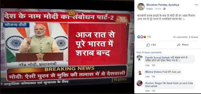 മെയ് 28ന് ഉത്തര്പ്രദേശില് വ്യാജമദ്യ ദുരന്തത്തില് 23പേര് മരിച്ചതിന് ശേഷം സോഷ്യല് മീഡിയയില് ഒരു ചിത്രം പ്രചരിക്കുന്നുണ്ട്. ‘ഇന്ന് രാത്രി മുതല് രാജ്യത്ത് മദ്യം നിരോധിച്ചു’ എന്ന് നരേന്ദ്രമോഡി പ്രഖ്യാപിക്കുന്നതിന്റെ ചിത്രമാണ് പ്രചരിക്കുന്നത്. ആജ് തക്ക് ചാനലിന്റെ ലോഗോയും ചിത്രത്തിനോടൊപ്പമുണ്ട്.
