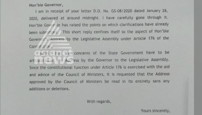 ഭരണഘടനാപരമായ ഉത്തരവാദിത്വം ഗവര്ണര്ക്കുണ്ടെന്നും മന്ത്രിസഭ അംഗീകരിച്ച പ്രസംഗം കൂട്ടിച്ചേര്ക്കലുകളോ ഒഴിവാക്കലുകളോ ഇല്ലാതെ വായിക്കണമെന്നാണ് കത്തില് ആവശ്യപ്പെടുന്നത്.
