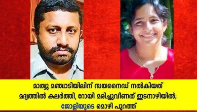 തലേദിവസം മാത്യുവിനൊപ്പമിരുന്ന് മദ്യപിച്ചതിന് ശേഷം ബാക്കി വന്ന മദ്യത്തിലാണ് പിറ്റേ ദിവസം സയനൈഡ് കലക്കി നല്കിയതെന്നും ജോളി പറഞ്ഞു. മാത്യുവിന് ഭക്ഷണത്തില് കലര്ത്തിയാണ് സയനൈഡ് നല്കിയതെന്നായിരുന്നു നേരത്തെ വന്ന റിപ്പോര്ട്ടുകള്.