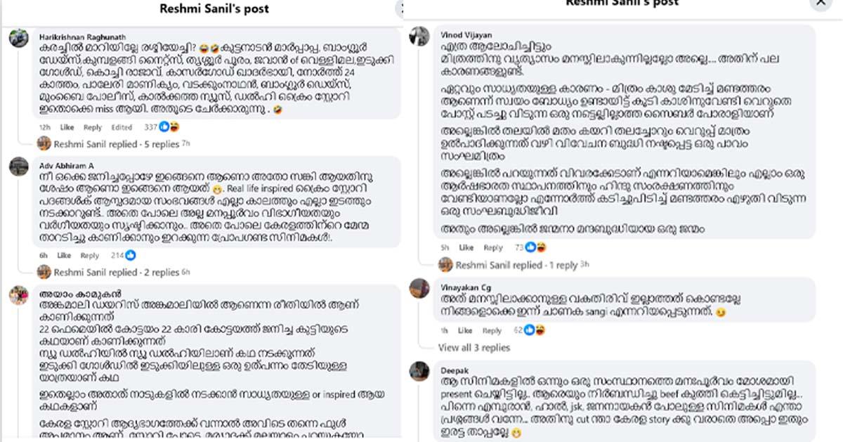‘കുട്ടനാടന് മാര്പ്പാപ്പ, കുമ്പളങ്ങി നൈറ്റ്സ്, തൃശൂര് പൂരം, കൊച്ചി രാജാവ്, കാസര്ഗോഡ് കാദര്ഭായി, മുംബൈ പൊലീസ്, ദല്ഹി ക്രൈംസ് എന്നീ സിനിമകളും ചേര്ക്കാമായിരുന്നു’, ‘അങ്കമാലി ഡയറീസ് അവിടുത്തെ കഥയാണ് കാണിക്കുന്നത്. ദല്ഹിയില് നടക്കുന്ന കഥയാണ് ന്യൂദല്ഹി സിനിമയിലുള്ളത്. കേരള സ്റ്റോറി എന്ന് പേരിട്ടിട്ട് വേറൊരു നാട്ടിലെ കഥ കാണിക്കുമ്പോള് സങ്കികളല്ലാത്തവര് പ്രതികരിക്കും’ എന്നിങ്ങനെയാണ് മറ്റ് കമന്റുകള്.
