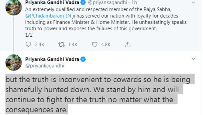 നാണംകെട്ട ഭീരുക്കളാണ് ചിദംബരത്തെ വേട്ടയാടുന്നതെന്നും പരിണിത ഫലം എന്തായിരുന്നാലും അദ്ദേഹത്തോടൊപ്പം ഉറച്ച് നില്ക്കുമെന്നും പ്രിയങ്ക വ്യക്തമാക്കി.