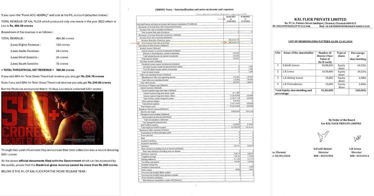 Leo’s 600 crore collection is FAKE ! proof Leo production company Kal Flick has filed its annual income statement, proving that it has earned a profit of just 404 crores, making it less than 200 crores #LEOSCAMpic.twitter.com/wIzic6CCFm
