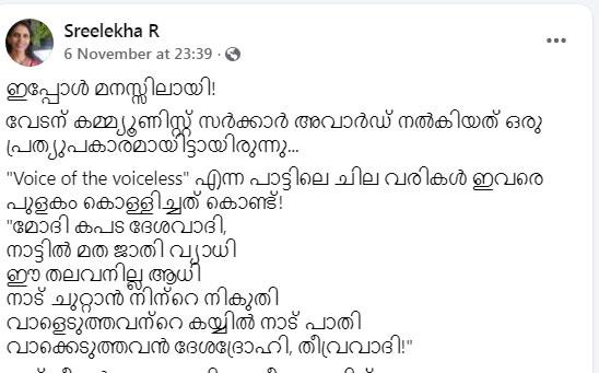 വാക്കെടുത്തവന് ദേശദ്രോഹി, തീവ്രവാദി,’ ശ്രീലേഖ പങ്കുവെച്ച വരികള്.