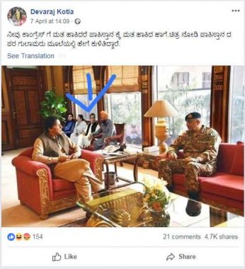 2019 ഏപ്രില് നാലിന് പാക് ആര്മി ജനറല് ഖമര് ജാവേദ് ബജ്വയും ഇമ്രാന് ഖാനും യോഗം ചേര്ന്ന വേളയിലെ ഫോട്ടോ എഡിറ്റ് ചെയ്ത് രാഹുല് ഗാന്ധിയ്ക്കും മമതയ്ക്കുമെതിരെ പ്രചരണത്തിന് ഉപയോഗിക്കുകയായിരുന്നു. ഏപ്രില് ഏഴിന് ഒരു ഫേസ്ബുക്ക് പോസ്റ്റില് പ്രസിദ്ധീകരിച്ച ഈ ഫോട്ടോ 4500 ലേറെ തവണയാണ് ഷെയര് ചെയ്യപ്പെട്ടത്.