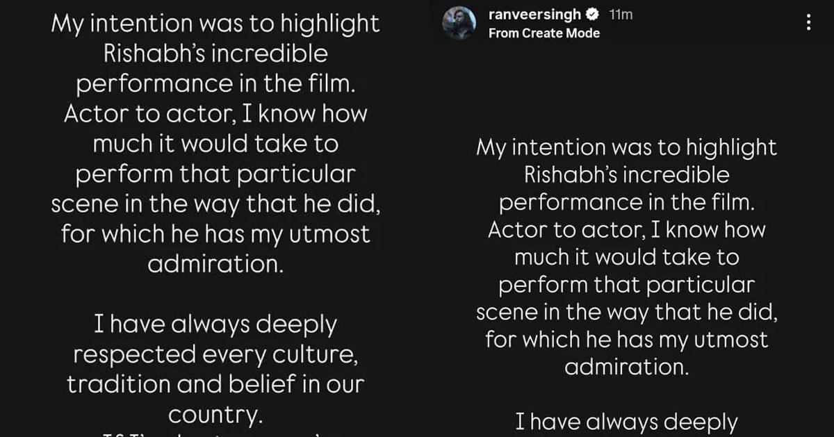 റിഷബിന്റെ അസാമാന്യ പ്രകടനത്തെ എടുത്തു കാണിക്കുക എന്നത് മാത്രമായിരുന്നു തന്റെ ഉദ്ദേശമെന്നും ആരുടെയങ്കിലും വികാരത്തെ വ്രണപ്പെടുത്തിയെങ്കില് അവരോട് ക്ഷമ ചോദിക്കുന്നുവെന്നും രണ്വീര് കുറിച്ചു. തന്റെ ഇന്സ്റ്റാഗ്രാം സ്റ്റോറിലൂടെയായിരുന്നു താരത്തിന്റെ പ്രതികരണം.