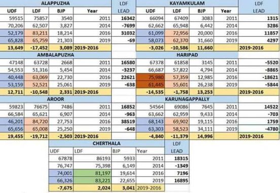 2016ലെ നിയമസഭാ തെരഞ്ഞെടുപ്പില് രമേശ് ചെന്നിത്തല മത്സരിച്ച ഹരിപ്പാട് ഒഴികെയുള്ള ആലപ്പുഴയിലെ എല്ലാ മണ്ഡലങ്ങളും എല്.ഡി.എഫിനൊപ്പമായിരുന്നു. 18621 വോട്ടിന്റെ ഭൂരിപക്ഷത്തിലാണ് നിയമസഭാ തെരഞ്ഞെടുപ്പില് ഹരിപ്പാട് രമേശ് ചെന്നിത്തല ജയിച്ചത്. ഇവിടെ 2016ല് 75980 വോട്ടുകള് നേടിയ യു.ഡി.എഫിന് ഇത്തവണ വോട്ട് 61445 ആയി കുറയുകയാണുണ്ടായത്. വോട്ടിലുണ്ടായ കുറവാകട്ടെ, ചെറുതെന്ന് പറഞ്ഞ് തള്ളിക്കളയാന് കഴിയുന്ന ഒന്നല്ല. കൃത്യം 14535 വോട്ടുകളാണ് കുറഞ്ഞത്. അതായത് ആലപ്പുഴയില് ആരിഫ് നേടിയ ഭൂരിപക്ഷത്തേക്കാള് കൂടുതല്.