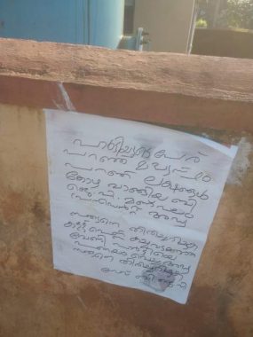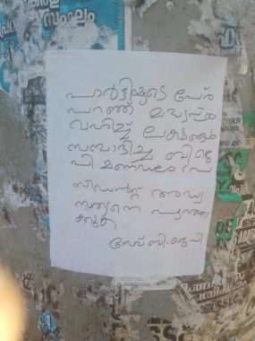 ‘പാര്ട്ടിയുടെ പേര് പറഞ്ഞ് മധ്യസ്ഥം പറഞ്ഞ് ലക്ഷങ്ങള് കോഴ വാങ്ങിയ ബി.ജെ.പി മണ്ഡലം പ്രസിഡന്റ് അഡ്വ. സത്യനെ തിരിച്ചറിയുക. കള്ള്, പെണ്ണ് കച്ചവടക്കാര്ക്കു വേണ്ടി പാര്ട്ടിയെ പണയം വെച്ച അഡ്വ. സത്യനെ തിരിച്ചറിയുക’ എന്നും പോസ്റ്ററില് ആരോപണമുണ്ട്. സത്യനെ പാര്ട്ടിയില് നിന്നു പുറത്താക്കണമെന്നും ആവശ്യമുണ്ട്.