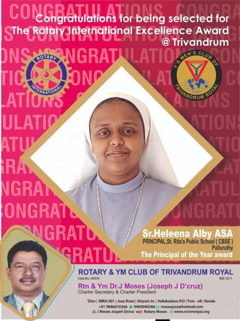തിരുവനന്തപുരം ഡി.സി.സി അംഗവും മത്സ്യത്തൊഴിലാളി കോണ്ഗ്രസ് ദേശീയ കമ്മിറ്റി അംഗവുമായ ജെ. മോസസ് ജോസഫ് ഡിക്രൂസാണ് സിസ്റ്റര് ഹെലീന ആല്ബിക്ക് പുരസ്കാരം സമ്മാനിക്കുന്നത്. റോട്ടറി ഇന്റര്നാഷണല് എക്സലന്സ് അവാര്ഡുകളിലെ ഏറ്റവും മികച്ച പ്രിന്സിപ്പാളിനുള്ള പുരസ്കാരമാണ് സിസ്റ്റര് ഹെലീനക്ക് നല്കുന്നത്.