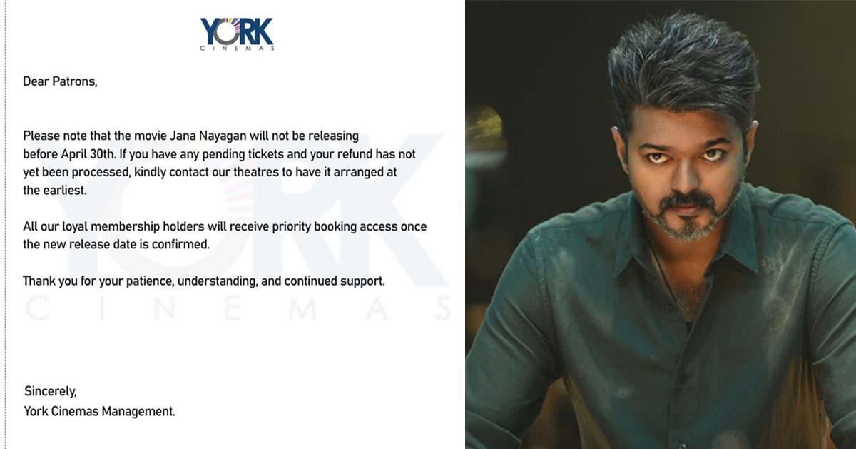 എന്നാല് ചിത്രം ഏപ്രില് 30ന് ശേഷം മാത്രമേ റിലീസാകുള്ളൂവെന്ന വാര്ത്തയാണ് ഇപ്പോള് പുറത്തുവരുന്നത്. ജന നായകന്റെ കാനഡയിലെ വിതരണക്കാരായ യോര്ക്ക് സിനിമാസ് കഴിഞ്ഞദിവസം പുറത്തുവിട്ട പ്രസ് റിലീസിലാണ് ഇക്കാര്യം പറഞ്ഞത്. കഴിഞ്ഞദിവസം രാത്രിയാണ് പ്രസ് റിലീസ് പുറത്തുവിട്ടത്. ഇതോടെ ആരാധകര് കണ്ഫ്യൂഷനിലായിരിക്കുകയാണ്.