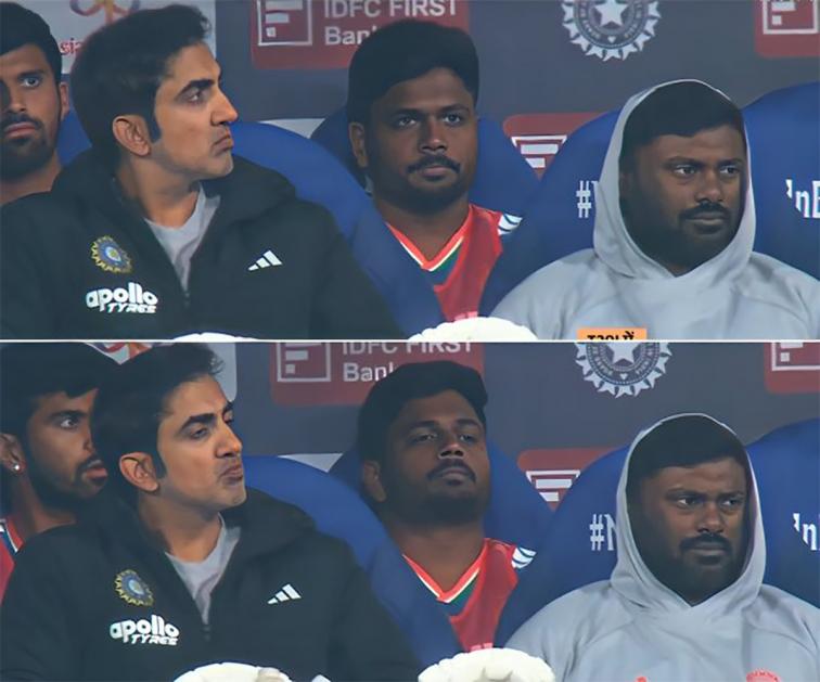 രണ്ടാം ടി-20യ്ക്കിടെ ഡഗ്ഔട്ടില് തുടരുന്ന സഞ്ജു സാംസണ്. Photo: Screen Grab during the match