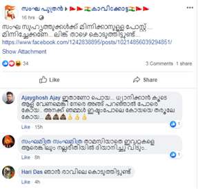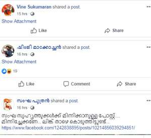 തുടര്ന്ന് സംഘപരിവാര് ഗ്രൂപ്പിലേക്ക് ഈ പോസ്റ്റുകള് സനല് ബി നായര്, സംഘപുത്രന് എന്നീ പ്രൊഫൈലുകള് കാവിപ്പട, കാവികോട്ട തുടങ്ങി സംഘപരിവാര് സോഷ്യല് മീഡിയ ഗ്രൂപ്പിലേക്ക് പോസ്റ്റ് ഷെയര് ചെയ്യുകയായിരുന്നു.