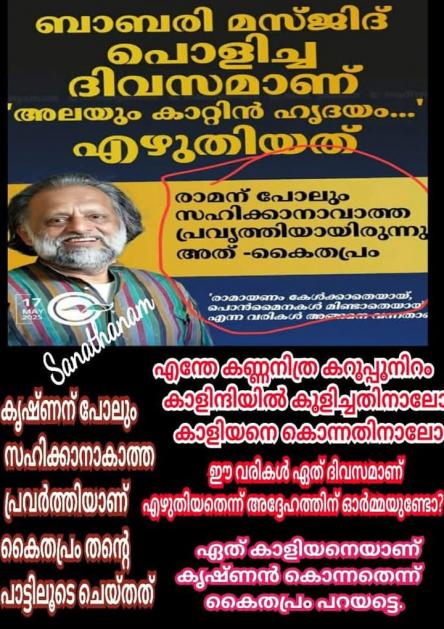 വാത്സല്യം എന്ന മലയാള സിനിമ സീതാരാമന്‍മാരുടെ കഥയാണെന്നും ബാബരി മസ്ജിദ് പൊളിച്ച ദിവസമാണ് താന്‍ ‘അലയും കാറ്റിന്‍ ഹൃദയം’ എന്ന പാട്ടെഴുതിയതെന്നുമാണ് കൈതപ്രം പറഞ്ഞത്.
