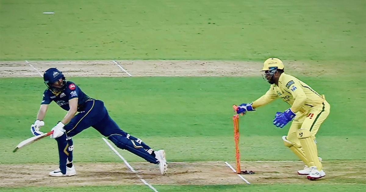 നൂര് അഹമ്മദ് എറിഞ്ഞ ഏഴാം ഓവറിലെ വൈഡായി എറിഞ്ഞ നാലാം പന്തില് ഷോട്ടടിക്കാന് ഗില് സ്റ്റെപ്ഔട്ട് ചെയ്തു. ഈ ശ്രമം വിഫലമായതോടെ ഗുജറാത്ത് നായകന് കാല് ക്രീസിലേക്ക് തിരിച്ചുകുത്താന് ശ്രമിച്ചു. പക്ഷേ, അതിനകം പന്ത് കൈക്കലാക്കിയ സഞ്ജു ഗില്ലിന്റെ കാല് മൈതാനത്ത് തൊടുന്നതിന് മുമ്പ് തന്നെ സ്റ്റംപിങ് നടത്തുകയായിരുന്നു.