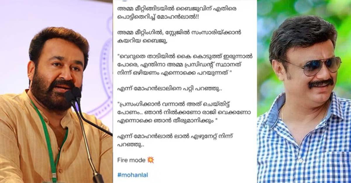 സോഷ്യല്‍ മീഡിയയിലെ പല പേജിലും കഴിഞ്ഞ കുറച്ചുമണിക്കൂറുകളായി ഒരൊറ്റ കാര്യമാണ് ചര്‍ച്ചാവിഷയം. കഴിഞ്ഞദിവസം കൊച്ചിയില്‍ നടന്ന അമ്മയുടെ ജനറല്‍ ബോഡി മീറ്റിങ്ങിനിടെ മോഹന്‍ലാലും ബൈജുവും വാക്കുതര്‍ക്കമായെന്ന പോസ്റ്റ് പല പേജുകളില്‍ പ്രചരിച്ചുകൊണ്ടിരിക്കുകയായിരുന്നു. എവിടെയും റിപ്പോര്‍ട്ട് ചെയ്യാത്ത കാര്യമായതിനാല്‍ പലരും ഈ വാര്‍ത്തയുടെ ക്രെഡിബിലിറ്റിയെ ചോദ്യം ചെയ്തിരുന്നു.