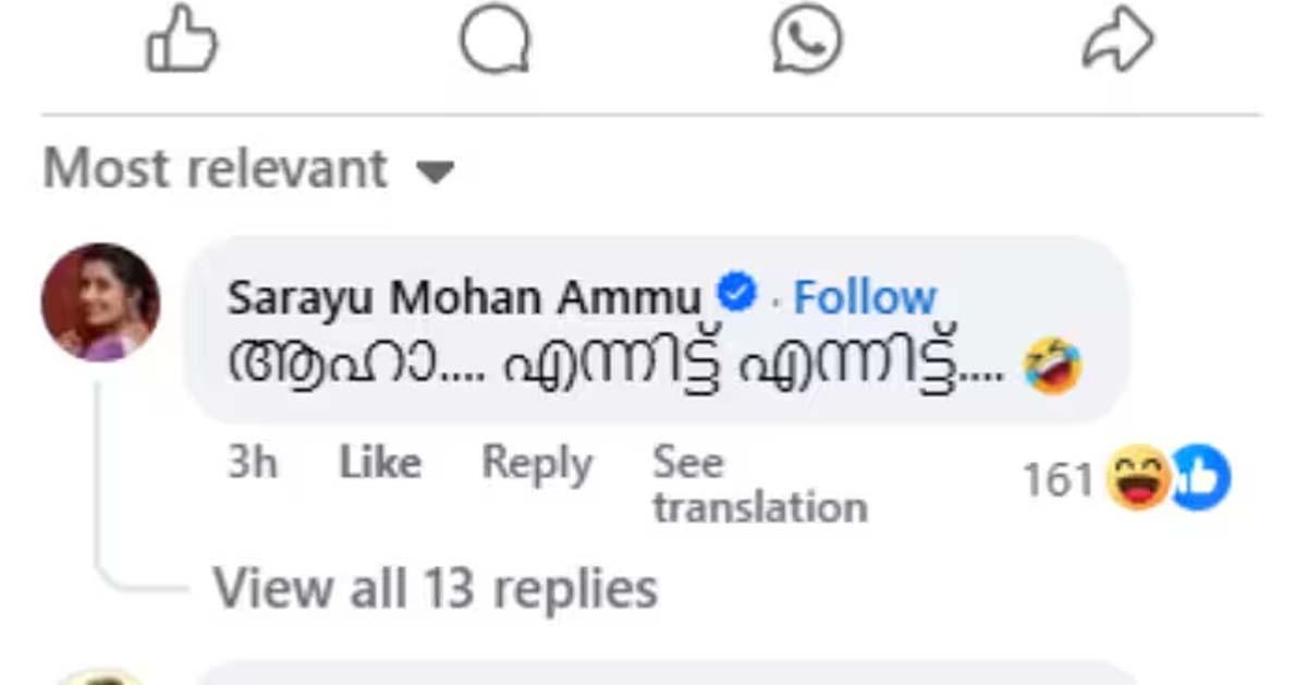 വളരെ വേഗത്തില്‍ വൈറലായ ഈ പോസ്റ്റിന് താഴെ നടി സരയു പരിഹാസരൂപത്തില്‍ കമന്റ് ചെയ്യുകയായിരുന്നു. ‘ആഹാ എന്നിട്ട്.. എന്നിട്ട്’ എന്ന് ചോദിച്ചുകൊണ്ട് ചിരിക്കുന്ന ഒരു ഇമോജിയോട് കൂടിയാണ് കമന്റ് പങ്കുവെച്ചത്. ഇതോടെ ഈ വാര്‍ത്ത വ്യാജമാണെന്ന് ഉറപ്പാവുകയും ചെയ്തു. എവിടെ നിന്നാണ് ഈ വാര്‍ത്ത പ്രചരിച്ചതെന്ന് ഇതുവരെ വ്യക്തമായിട്ടില്ല.