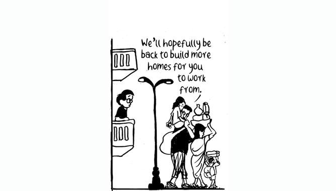 ഇന്ത്യന് എക്സ്പ്രസിലെ ഇ.പി ഉണ്ണിയാണ് അതിഥി സംസ്ഥാനത്തൊഴിലാളികളുടെ പലായനം ആദ്യം കാര്ട്ടൂണിലേക്ക് കൊണ്ടുവരുന്നത്. എല്ലാവര്ക്കും വീട്ടിലിരുന്ന് ജോലി ചെയ്യാനുതകുന്ന വീടുകള് നിര്മ്മിക്കാന് ഞങ്ങള്ക്ക് തിരിച്ചുവരാനാകുമെന്ന് പ്രതീക്ഷിക്കുന്നു എന്ന കാര്ട്ടൂണായിരുന്നു മലയാളി കൂടിയായ ഉണ്ണി വരച്ചത്.