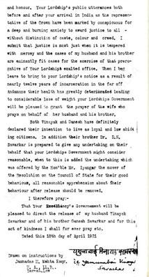 1910 മാര്ച്ച് 13നാണ് സവര്ക്കര് അറസ്റ്റിലായത്. 1911 ജൂലൈ നാലിന് സവര്ക്കറെ ആന്ഡമാനിലെ സെല്ലുലാര് ജയിലിലേക്ക് കൊണ്ടുപോകുകയും ചെയ്തു. 1911 ഓഗസ്റ്റ് 30ന് സവര്ക്കര് തന്റെ ആദ്യ മാപ്പപേക്ഷ അയച്ചു. 1913 നവംബര് 14ന് രണ്ടാമത്തെ ദയാഹരജി സമര്പ്പിച്ചു. തുടര്ന്ന് 1918ല് മൂന്നാമതൊരു ദയാഹരജിയും കൂടി നല്കി. 1920 മാര്ച്ച് 30ന് സവര്ക്കര് മറ്റൊരു ഹരജി കൂടി നല്കിയിരുന്നു.