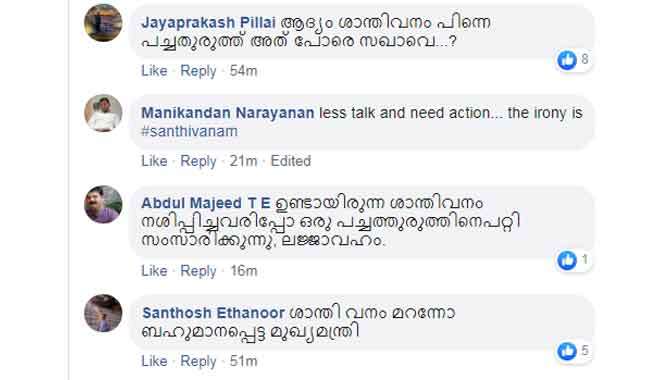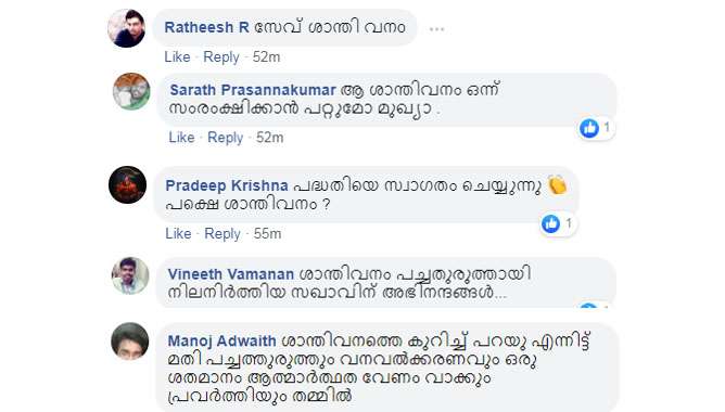 ഇതിന് താഴെയാണ് ശാന്തിവനം സംരക്ഷിക്കണമെന്നാവശ്യപ്പെട്ടുള്ള കമന്റുകള് നിറയുന്നത്. ഉള്ള കാട് വെട്ടിക്കളഞ്ഞ വര്ഷത്തില് (ശാന്തി വനം) ഇച്ചിരി പൈസ ഉണ്ടാക്കാനുള്ള പാര്ട്ടി തട്ടിപ്പായിട്ടേ തോന്നുന്നുള്ളുവെന്നാണ് മുഖ്യമന്ത്രിയുടെ പേജില് വന്ന ഒരു കമന്റ്.