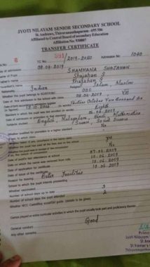 ടി.സിയ്ക്ക് അവര് ആവശ്യപ്പെട്ടതു പ്രകാരം അപേക്ഷ നല്കിയപ്പോള് കാരണം എഴുതേണ്ട കോളത്തില് എഴുതിയത് തട്ടമിട്ട് ക്ലാസില് വരാന് അനുവദിക്കാത്തതുകൊണ്ട് ഞങ്ങള് പോകുന്നുവെന്നാണ്. പക്ഷേ ടി.സിയില് അവര് ‘ബെറ്റര് ഫെസിലിറ്റീസ്’ എന്ന് തിരുത്തുകയാണുണ്ടായത്.’