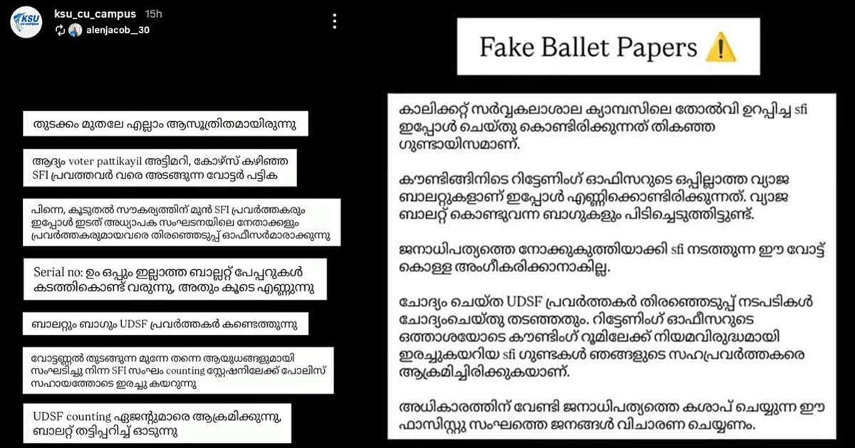 എന്നാൽ, വ്യാജമെന്ന് ആരോപിച്ച് യു.ഡി.എസ്.എഫ് പ്രവർത്തകർ പ്രീസൈഡിങ് ഓഫീസർ ഒപ്പിട്ട ബാലറ്റ് പേപ്പറുകൾ കീറിയെറിഞ്ഞെന്ന് എസ്.എഫ്.ഐയും ആരോപിച്ചു. ഇതിനെ സാധൂകരിക്കുന്ന വീഡിയോകൾ എസ്.എഫ്.ഐയും തങ്ങളുടെ സോഷ്യൽ മീഡിയ അക്കൗണ്ടുകളിൽ പങ്കുവെച്ചിട്ടുണ്ട്.