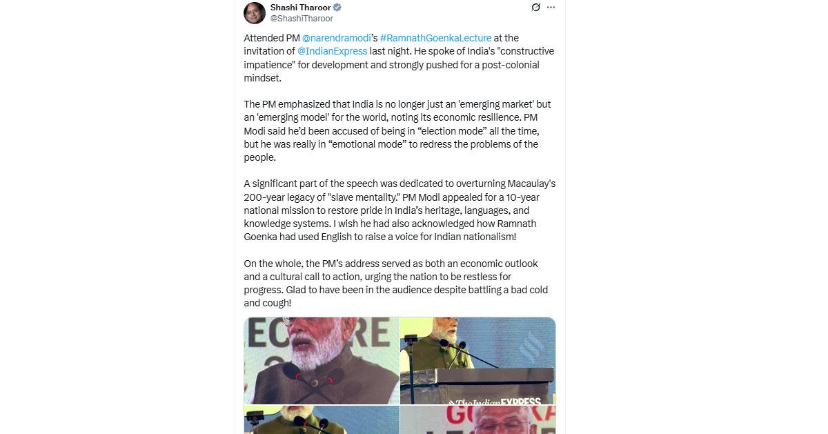 ഇന്ത്യന് എക്സ്പ്രസ് നടത്തിയ രാംനാഥ് ഗോയങ്കെ ലക്ചറില് പങ്കെടുത്താണ് പ്രധാനമന്ത്രി മോദി സംസാരിച്ചത്. പ്രധാനമന്ത്രിയുടെ ഈ പ്രസംഗത്തിലെ പ്രസക്തമായ ഭാഗങ്ങള് പങ്കിട്ടുകൊണ്ടാണ് തരൂരിന്റെ കുറിപ്പ്.