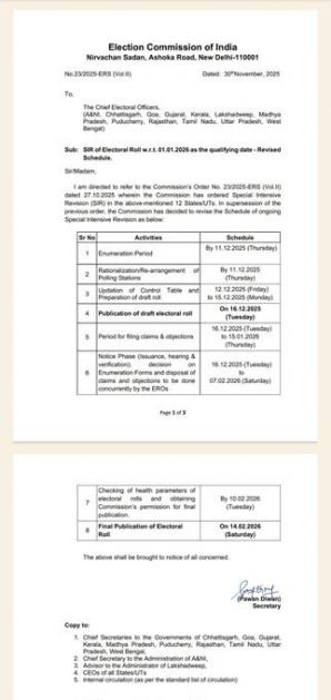ഉത്തരവ് പ്രകാരം 2026 ഫെബ്രുവരി 14ന് അന്തിമ വോട്ടര് പട്ടിക പ്രസിദ്ധീകരിക്കും. കേരളത്തിലെ ബി.എല്.ഒമാര് ഇതുവരെ 99 ശതമാനം എന്യൂമറേഷന് ഫോമുകള് വിതരണം ചെയ്തിട്ടുണ്ടെന്നാണ് സംസ്ഥാന മുഖ്യ തെരഞ്ഞെടുപ്പ് ഓഫീസര് പറയുന്നത്.