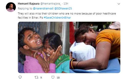 ‘ബീഹാറിലെ 150 കുട്ടികളുണ്ട് ജീവിതത്തിന്റെ സ്പോട്ട് കളിക്കാന് പറ്റാതെയായിട്ട്. ദയവായി അവര്ക്കുവേണ്ടിയും ചില വാക്കുകള് മാറ്റിവെക്കൂ’ എന്നാണ് ട്വീറ്റിനു കീഴില് വന്ന ഒരു പ്രതികരണം.