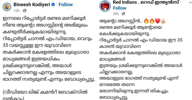 ഇതുപോലുള്ള അബദ്ധം കേരളത്തിലെ ഇടത് അനുകൂലികൾക്കും സി.പി.ഐ.എം പ്രവര്ത്തകർക്കും സംഭവിക്കാതിരിക്കട്ടെയെന്നാണ് സോഷ്യല് മീഡിയ പറയുന്നത്. ബിനീഷ് കോടിയേരി അടക്കമുള്ളവര്ക്ക് ആന്റോ അഗസ്റ്റിന് തന്നെയാണോ ഈ കുറിപ്പ് എഴുതി നല്കിയതെന്നും ചിലര് ചോദിക്കുന്നുണ്ട്.