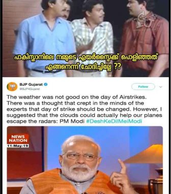 മോശം കാലാവസ്ഥയുടെ പശ്ചാലത്തില് ബാലാകോട്ട് ആക്രമണം മാറ്റിവെക്കാമെന്ന് ഉന്നത ഉദ്യോഗസ്ഥര് പറഞ്ഞെങ്കിലും മേഘങ്ങള് ഉള്ളതുകൊണ്ട് പാക് റഡാറുകള്ക്ക് ഇന്ത്യന് വിമാനങ്ങളെ കണ്ടെത്താന് കഴിയില്ലെന്ന ബുദ്ധി താനാണ് സൈന്യത്തിന് നല്കിയതെന്നായിരുന്നു അഭിമുഖത്തില് മോദി പറഞ്ഞത്. ഇതിനെയാണ് സോഷ്യല് മീഡിയ ട്രോളുകളിലൂടെ പരിസഹിക്കുന്നത്….ട്രോളുകളിലൂടെ…..
