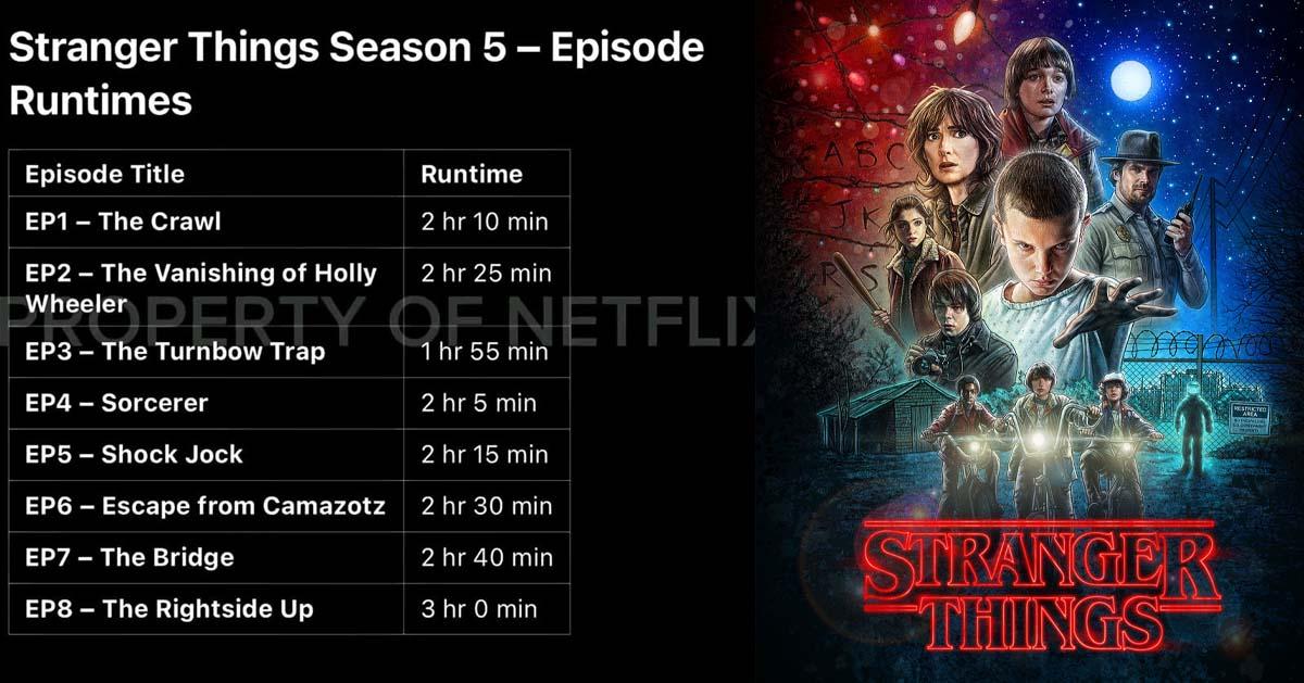 നവംബര് 24ന് ആദ്യത്തെ നാല് എപ്പിസോഡുകളും ക്രിസ്മസ് ദിനത്തില് ബാക്കിയുള്ള മൂന്ന് എപ്പിസോഡുകളും നെറ്റ്ഫ്ളിക്സ് പുറത്തുവിടും. ന്യൂ ഇയര് ഈവിനാണ് അവസാന എപ്പിസോഡ് സ്ട്രീം ചെയ്യുക. 2026 ആരംഭിക്കുന്നത് സ്ട്രെയ്ഞ്ചര് തിങ്സിന്റെ അവസാനത്തോടെയായിരിക്കും. ഇപ്പോഴിതാ ഓരോ എപ്പിസോഡിന്റെയും ദൈര്ഘ്യം എത്രയുണ്ടെന്ന് അണിയറപ്രവര്ത്തകര് പുറത്തുവിട്ടിരിക്കുകയാണ്.