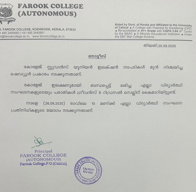 ‘ഫാറൂഖ് കോളേജ് യൂണിയന് തെരഞ്ഞെടുപ്പില് മതിയായ അറ്റന്ഡന്സ് ഇല്ലാത്ത എം.എസ്.എഫ് സ്ഥാനാര്ത്ഥികളുടെ നോമിനേഷന് സ്വീകരിച്ച മാനേജ്മെന്റ് – എം.എസ്.എഫ് അവിശുദ്ധ കൂട്ടുകെട്ടിനെതിരെ പ്രതിഷേധിക്കുക,’ ഫ്രറ്റേണിറ്റി മൂവ്മെന്റ് ഫാറൂഖ് കോളേജ് പ്രസ്താവനയില് പറഞ്ഞു.