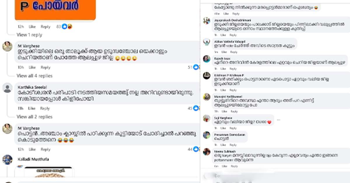 ഇത്രക്ക് വിവരമില്ലാത്തയാളാണോ കോടീശ്വരന്‍ പരിപാടിയില്‍ അവതാരകനായി വന്നതെന്നും ചിലര്‍ ചോദിക്കുന്നുണ്ട്. തൃശൂര്‍ എടുത്തതുപോലെ ആലപ്പുഴയും എടുക്കാനാണോ ശ്രമമെന്നും ചിലര്‍ കമന്റ് പങ്കുവെക്കുന്നുണ്ട്. ഇടുക്കിയെയും പാലക്കാടിനെയും പിന്തള്ളി ആലപ്പുഴ ഏറ്റവും വലിയ ജില്ലയാകാന്‍ കുതിക്കുന്നു എന്നും കമന്റുകളുണ്ട്.