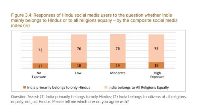 സോഷ്യല് മീഡിയ ഉപയോഗിക്കാത്തവര്ക്കിടയില് നടത്തിയ സര്വ്വേയില് 73%ത്തോളം ഹിന്ദുക്കളും അഭിപ്രായപ്പെട്ടതും ഇന്ത്യ മതേതര രാജ്യമായി തുടരണമെന്നാണ്. 19%പേരാണ് ഇന്ത്യ ഹിന്ദു രാജ്യമാവണം എന്ന് അഭിപ്രായപ്പെട്ടത്.
