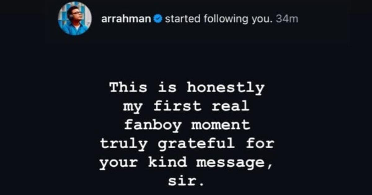 ‘ഇതാണ് റിയൽ ഫാൻ ബോയ് മൊമന്റ്’ എന്ന അടിക്കുറിപ്പോടെയാണ് സുഷിൻ ഇൻസ്റ്റാഗ്രാമിൽ സ്റ്റോറി പങ്കുവെച്ചത്. അതിനൊപ്പം തന്നെ എ.ആർ. റഹ്മാൻ തനിക്ക് അയച്ച മെസേജിനും അദ്ദേഹം നന്ദി അറിയിച്ചിട്ടുണ്ട്.
