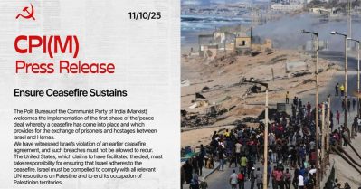 വെടിനിർത്തൽ കരാർ ഇസ്രഈൽ ലംഘിക്കില്ലെന്ന് ഉറപ്പുവരുത്തണം; യു.എസ് ഉത്തരവാദിത്തം ഏറ്റെടുക്കണം: സി.പി.ഐ.എം പി.ബി