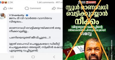 പണിയെടുത്ത് ജീവിച്ചൂടെ...; ഓണാവധി വെട്ടികുറയ്ക്കുമെന്ന ജനം ടി.വിയുടെ വ്യാജവാര്ത്തക്കെതിരെ ശിവന്കുട്ടി
