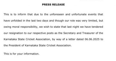 ചിന്നസ്വാമി സ്റ്റേഡിയത്തിന് സമീപത്തെ ദുരന്തം; കെ.എസ്.സി.എ സെക്രട്ടറിയും ട്രഷററും രാജിവെച്ചു