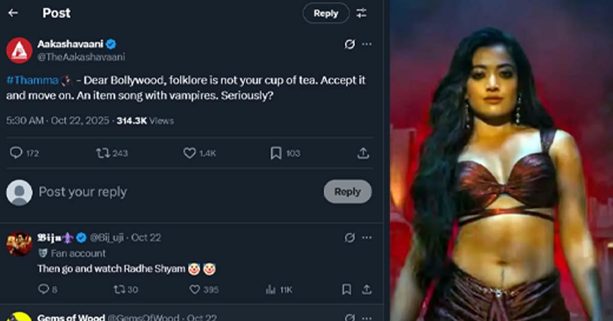 ചിത്രത്തെക്കുറിച്ച് ഒരു തെലുങ്ക് പേജ് പങ്കുവെച്ച റിവ്യൂവാണ് ഇപ്പോള് എക്സില് വൈറല്. ആകാശവാണി എന്ന പേജാണ് ഥാമയെ വിമര്ശിച്ചുകൊണ്ട് റിവ്യൂ പങ്കുവെച്ചത്. ചിത്രം വളരെ മോശമാണെന്നാണ് ആകാശവാണിയുടെ റിവ്യൂ. എന്നാല് റിവ്യൂവിനെക്കാള് ചിത്രത്തെക്കുറിച്ച് പറഞ്ഞ വാക്കുകളാണ് ചിലരെ ചൊടിപ്പിച്ചത്.