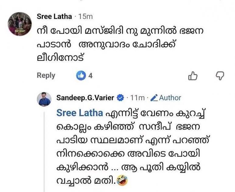 Content Highlight: The comments and replies to Sandeep Varier’s post supporting Nanda Govindam Bhajans are being discussed.