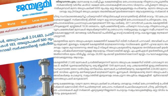 രണ്ടു ലക്ഷത്തോളം വരുന്ന മദ്രസ അധ്യാപകര്ക്ക് പെന്ഷനും ശമ്പളവും നല്കി മതപഠനത്തിന്റെ പേരില് കോടികളാണ് സര്ക്കാര് ഖജനാവില് നിന്ന് ചോര്ത്തുന്നത്’- ജന്മഭൂമി നല്കിയ വാര്ത്തയില് നിന്ന്.