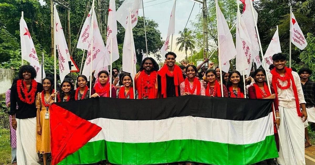 കോളേജുകളില്‍ എസ്.എഫ്.ഐ വിജയാഘോഷത്തില്‍ മുഴങ്ങിയത് ഫലസ്തീന് ഐക്യദാര്‍ഢ്യം പ്രഖ്യാപിച്ചും, ഇസ്രഈലിനെ ശക്തമായി എതിര്‍ത്തുമുള്ള മുദ്രാവാക്യങ്ങളുമായിരുന്നു. ‘ഫ്രം റിവര്‍ ടു സീ, ഫലസ്തീന്‍ വില്‍ ബി ഫ്രീ’ മുദ്രാവാക്യം വിദ്യാര്‍ത്ഥികള്‍ മുഴക്കി.