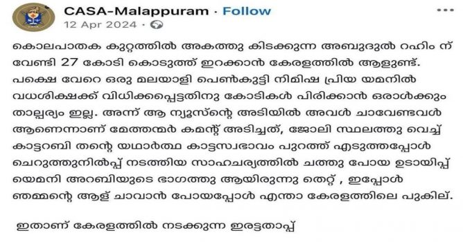 ‘കൊലപാതക കുറ്റത്തിൽ അകത്ത് കിടക്കുന്ന അബുദുൽ റഹീമിന് വേണ്ടി 27 കോടി കൊടുത്ത് ഇറക്കാൻ കേരളത്തിൽ ആളുണ്ട്. പക്ഷേ വേറെ ഒരു മലയാളി പെൺകുട്ടി നിമിഷ പ്രിയ യെമനിൽ വധശിക്ഷക്ക് വിധിക്കപ്പെട്ടതിന് കോടികൾ പിരിക്കാൻ ഒരാൾക്കും താത്പര്യം ഇല്ല. അന്ന് ആ ന്യൂസിന്റെ അടിയിൽ അവൾ ചാവേണ്ടവൾ ആണെന്നാണ് മേത്തന്മാർ കമൻ്റ് അടിച്ചത്. ജോലി സ്ഥലത്ത് വെച്ച് കാട്ടറബി തന്റെ യഥാർത്ഥ കാട്ടസ്വഭാവം പുറത്ത് എടുത്തപ്പോൾ ചെറുത്തുനിൽപ്പ് നടത്തിയ സാഹചര്യത്തിൽ ചത്തു പോയ ഉടായിപ്പ് യെമനി അറബിയുടെ ഭാഗത്ത് ആയിരുന്നു തെറ്റ്. ഇപ്പോൾ ഞമ്മന്റെ ആള് ചാവാൻ പോയപ്പോൾ എന്താ കേരളത്തിലെ പുകില്. ഇതാണ് കേരളത്തിൽ നടക്കുന്ന ഇരട്ടതാപ്പ്,’ കാസയുടെ പോസ്റ്റിൽ പറയുന്നു.