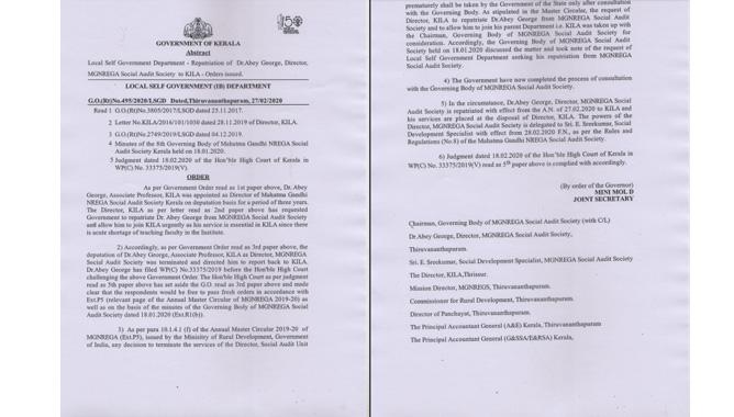 കോഴിക്കോട്: തൊഴിലുറപ്പ് പദ്ധതിയിലെ ക്രമക്കേട് പുറത്ത് കൊണ്ടു വന്ന സോഷ്യല് ഓഡിറ്റ് ഡയറക്ടര് പ്രൊഫ: എബി ജോര്ജിനെ സര്ക്കാര് വീണ്ടും നീക്കി. ആദ്യ തവണ നീക്കം ചെയ്തത് നിയമവിരുദ്ധമാണ് എന്ന് കണ്ടെത്തി ഹൈക്കോടതി സര്ക്കാര് ഉത്തരവ് റദ്ദാക്കിയതിന് തൊട്ട് പിന്നാലെയാണ് ഇന്നലെ ( 27.02.20) രാത്രി വൈകി പുതിയ ഉത്തരവ് ഇറങ്ങിയിരിക്കുന്നത്.