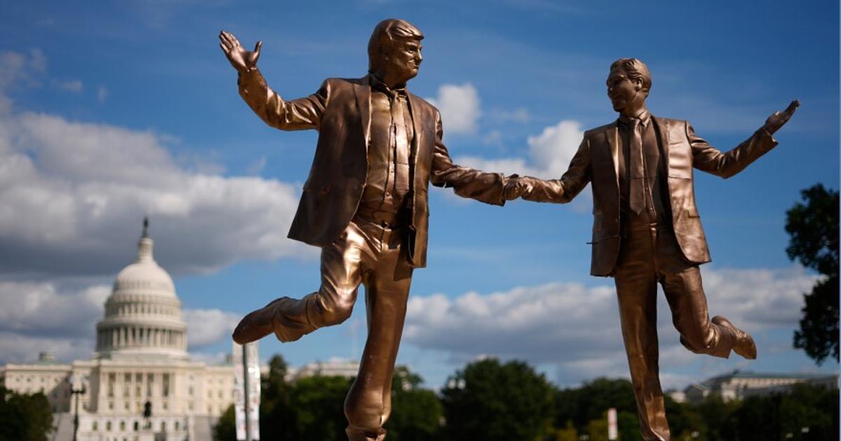 യു.എസ് പ്രസിഡന്റ് ഡൊണാള്ഡ് ട്രംപും ലൈംഗിക കുറ്റവാളി ജെഫ്രി എപ്സ്റ്റിനും തമ്മിലുളള സൗഹൃദത്തെ പരാമര്ശിക്കുന്നതാണ് പ്രതിമ.