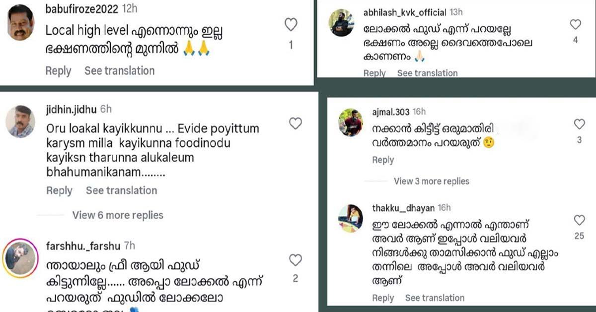 ‘അവര് ലോക്കലാണെങ്കില് നീ വെറും കൂറയാണ്, ജാഡേ’, ‘ഭക്ഷണത്തെ ലോക്കല് എന്ന് പറഞ്ഞ് നിന്ദിക്കരുത്’ ‘ഒരു ലോക്കല് ഭക്ഷണം കഴിക്കുന്നു, എവിടെ പോയിട്ടും കാര്യമില്ല, കഴിക്കുന്ന ഫുഡിനോടം കഴിക്കാന് തരുന്ന ആളുകളെയും ബഹുമാനിക്കണം’, ‘എന്തായാലും ഫ്രീ ഫുഡല്ലേ, അതിനെ ലോക്കലെന്നോ ബെറ്ററെന്നോ വേര്തിരിവില്ല’, എന്നിങ്ങനെയാണ് പല കമന്റുകളും.