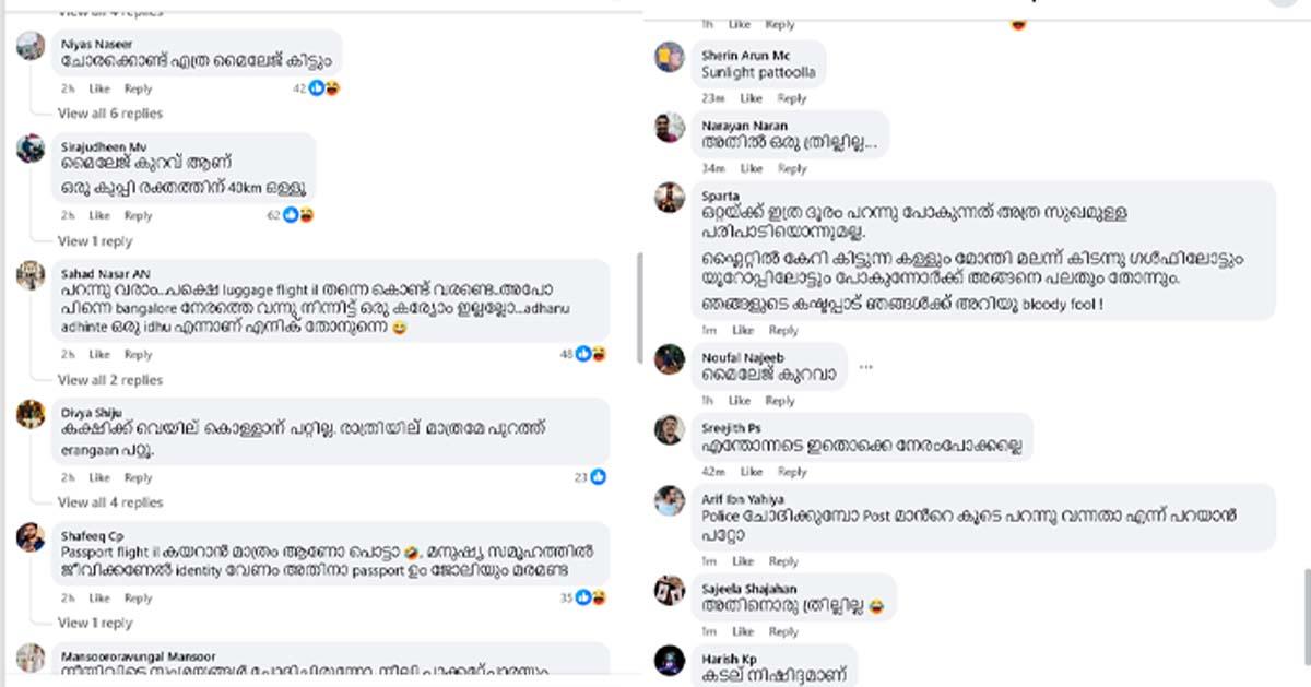 ‘എല്ലാം സിസ്റ്റമാറ്റിക് ആകണമെന്ന് നല്ല നിര്ബന്ധമുള്ളയാളാണ് നീലി’, ‘അത്രേം മൈലേജിനുള്ള ചോര വാങ്ങി കുടിക്കുന്ന കാശിനു ഒരു ടിക്കറ്റ് എടുത്ത് സീറ്റില് ഇരുന്നാല് പോരേ. പറക്കുന്ന കഷ്ടപ്പാടും ഇല്ല’, പറന്നു വന്നാലും ലഗേജ് കൊണ്ടുവരാന് ഫ്ളൈറ്റ് വേണ്ടേ, ലഗേജില്ലാതെ നേരത്തെ ബാംഗ്ലൂരിലെത്തിയിട്ട് എന്ത് ചെയ്യാനാ’ തുടങ്ങി നരവധി കമന്റുകളാണ് പലരും പങ്കുവെച്ചിട്ടുള്ളത്. രസകരമായ സംശയത്തിന് രസകരമായ മറുപടികളാണ് ഓരോരുത്തരും നല്കുന്നത്.