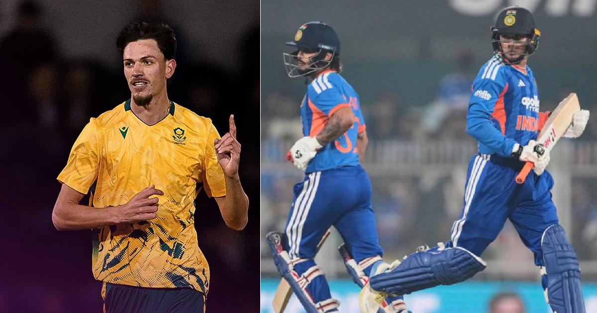 മാർകോ യാൻസനും അഭിഷേക് ശർമയും ഇഷാൻ കിഷനും . Photo: Crictracker/x.com