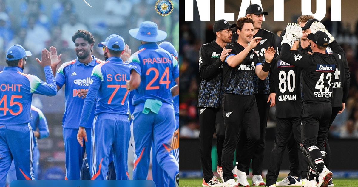 ഇന്ത്യൻ ടീമും ന്യൂസിലാൻഡ് ടീമും. Photo: BCCI& BlackCaps/x.com